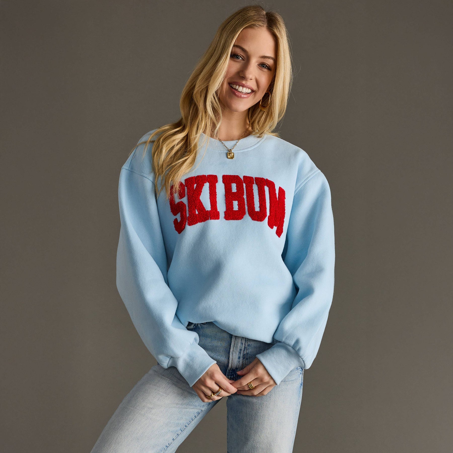Lt. blue sweatshirt Red "Ski Bum" textured text on the front 50% Polyester / 50% Cotton