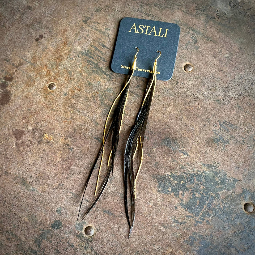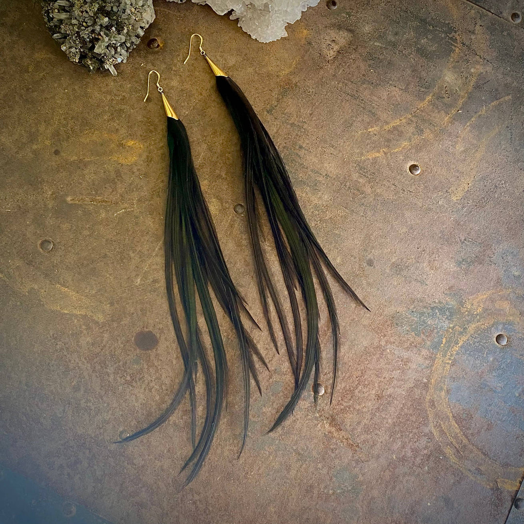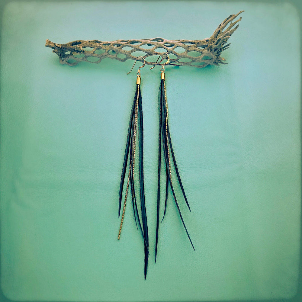 Earrings-Extra Long Feather-Golden Black, Boho Western
