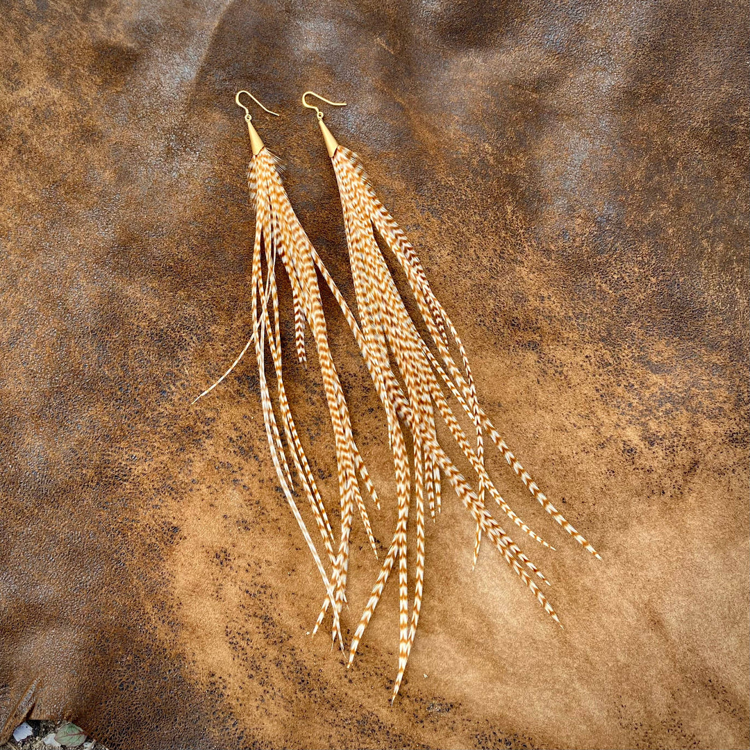 Earrings-Long Feather & Cone-Ginger Grizzly/Gold, Western