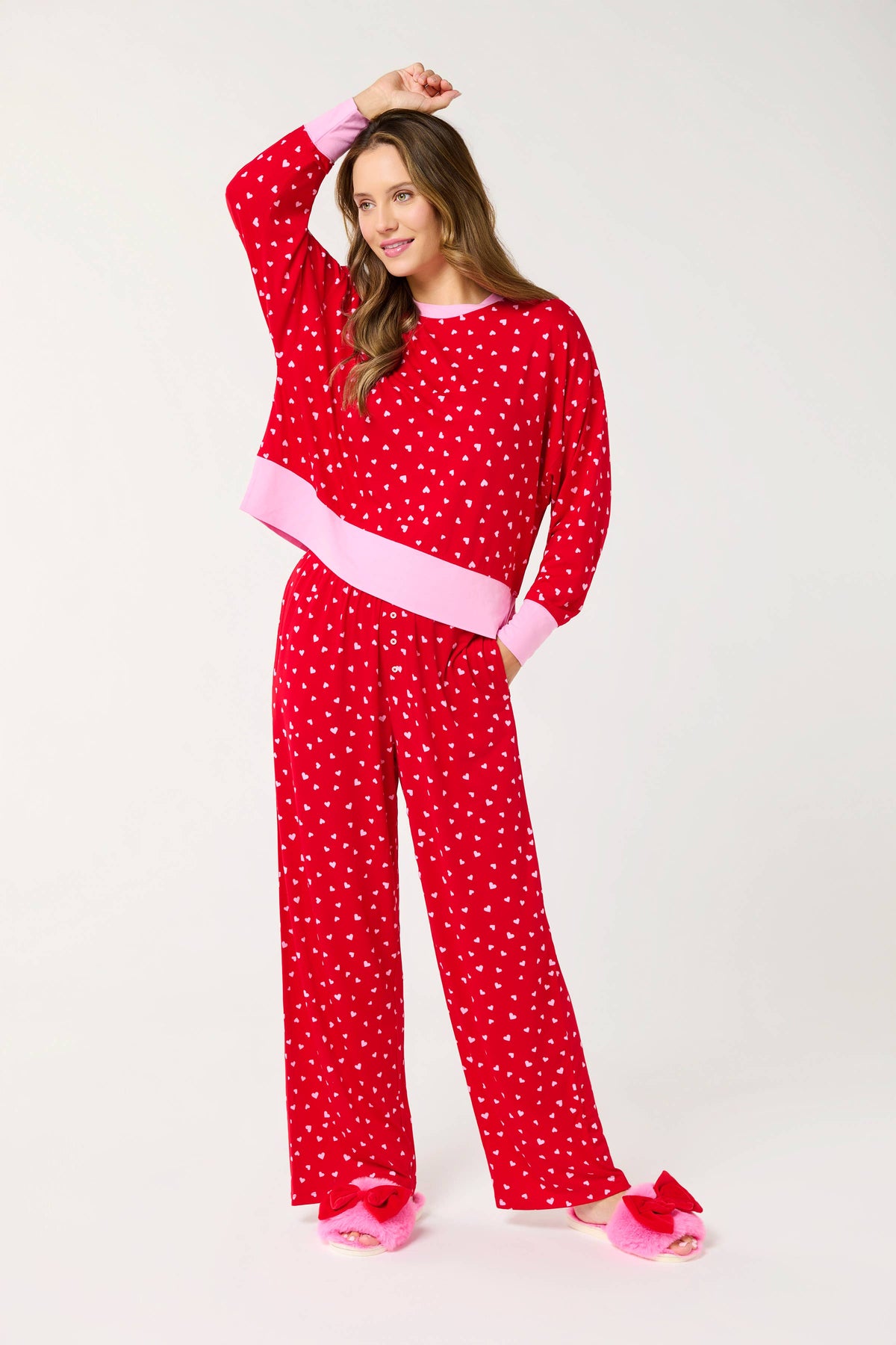 Made from 100% polyester with elastic waistband. Machine wash, tumble dry low.The Mini Hearts Ultra-Soft Jersey Knit PJ Set is a festive favorite with playful charm. This relaxed-fit set features a long sleeve pullover top and wide-leg pants with an easy 29" inseam. Scattered with tiny white hearts on vibrant red fabric, it’s finished with contrasting light pink trim at the collar, cuffs, and hem. With on-seam pockets and button detail at the waist, it blends cozy comfort with sweet detail.