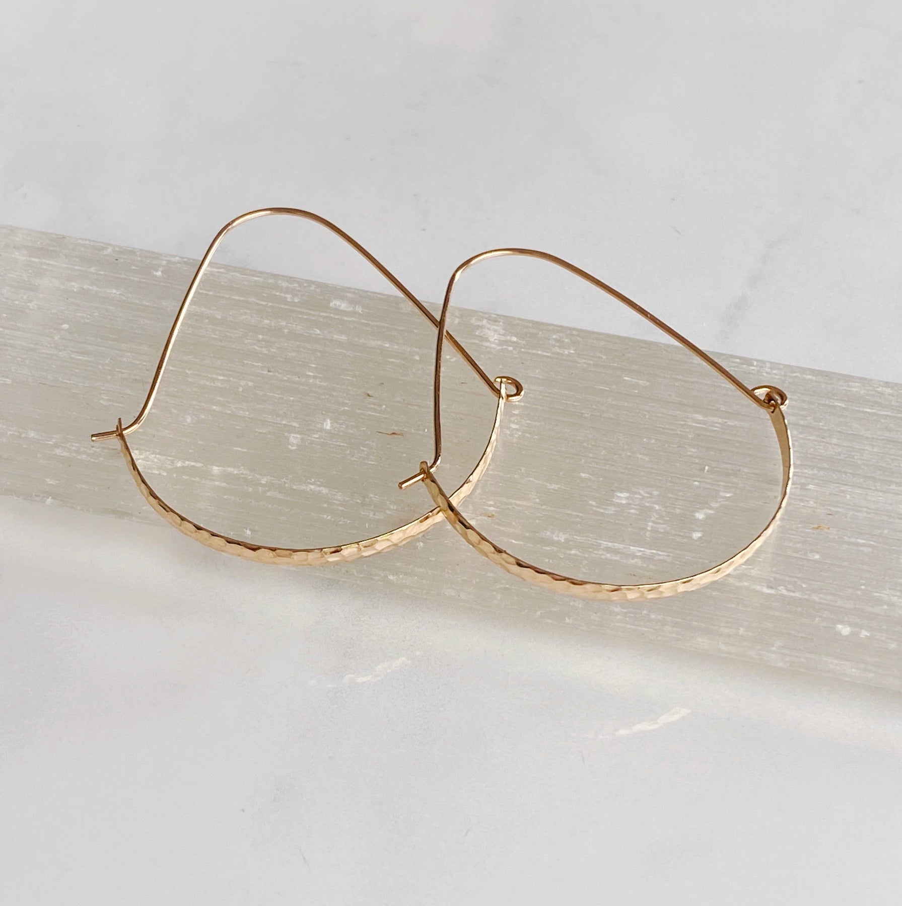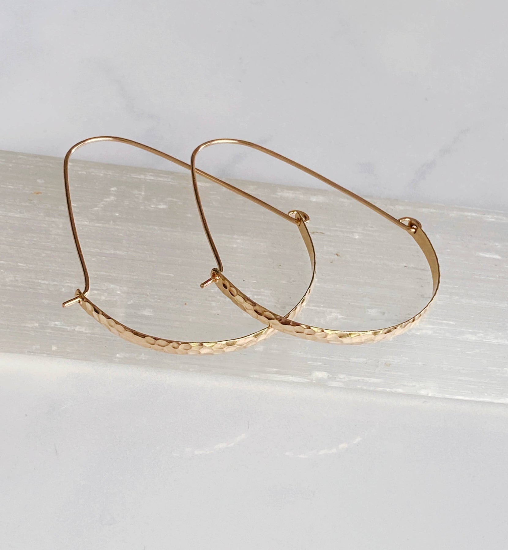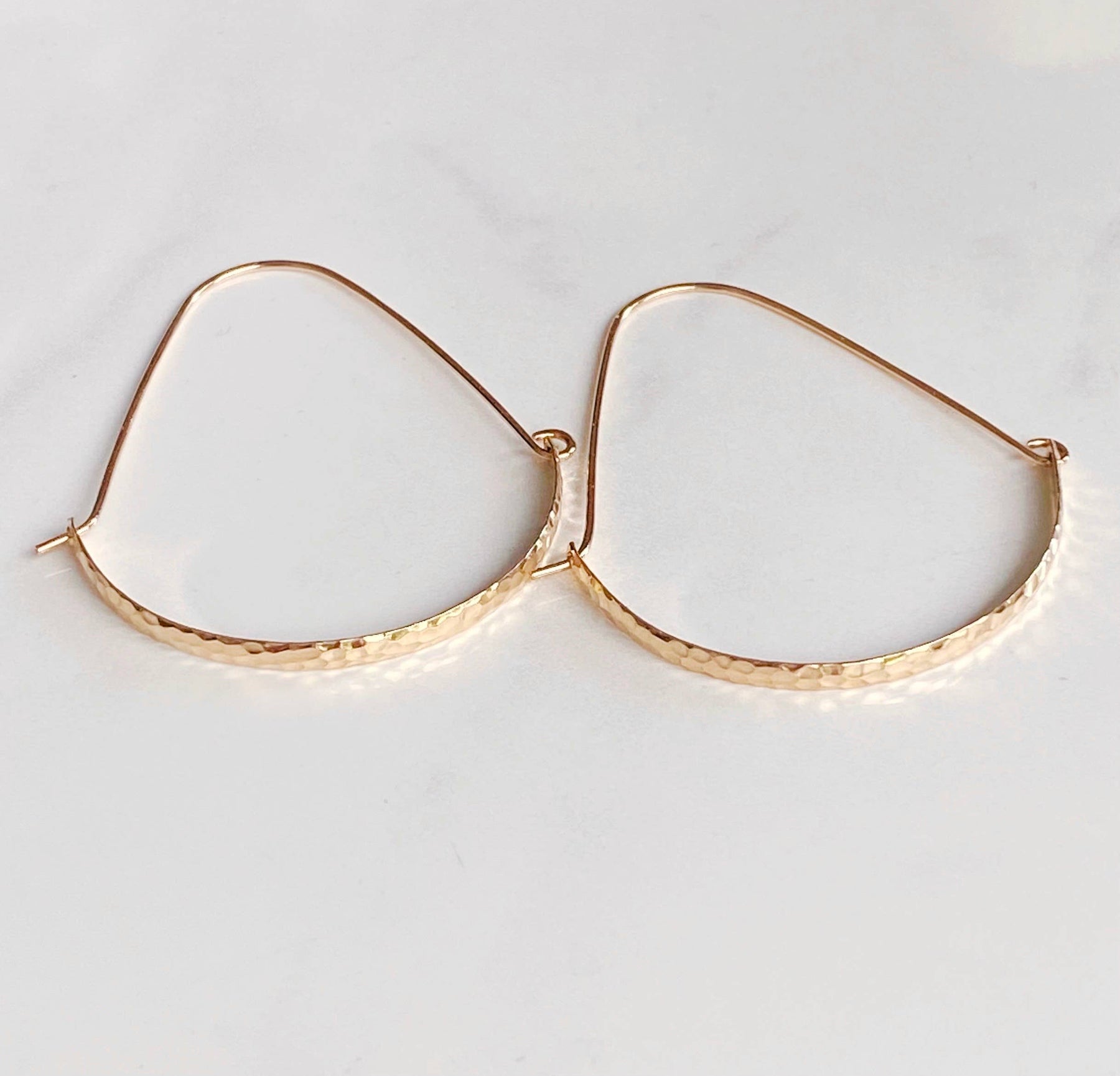 These stunning hoops are so lightweight yet really make a statement. The half hoop shape is hand forged from a flat 14kt gold fill or sterling silver rectangle wire and hammered with a dappled texture to catch the light. The hoop is suspended from 14kt gold filled or sterling silver wire that passes through the ear. The wire clasps to the back of the hoop. They are 1 3/4” from top to bottom.