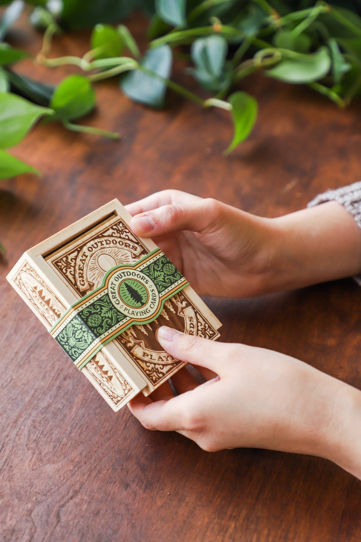 These deluxe playing cards bring the beauty of the great outdoors to your fingertips. From the exquisitely detailed card backs to the four suits represented by growing trees, flowing water, majestic mountains, and the expansive sky, every element in this illustrated deck depicts the wonder of nature. Housed in a responsibly sourced wooden box that is handsome enough to leave on the tabletop and light enough to take on-the-go, this set will delight outdoor enthusiasts, art lovers, and card players alike.