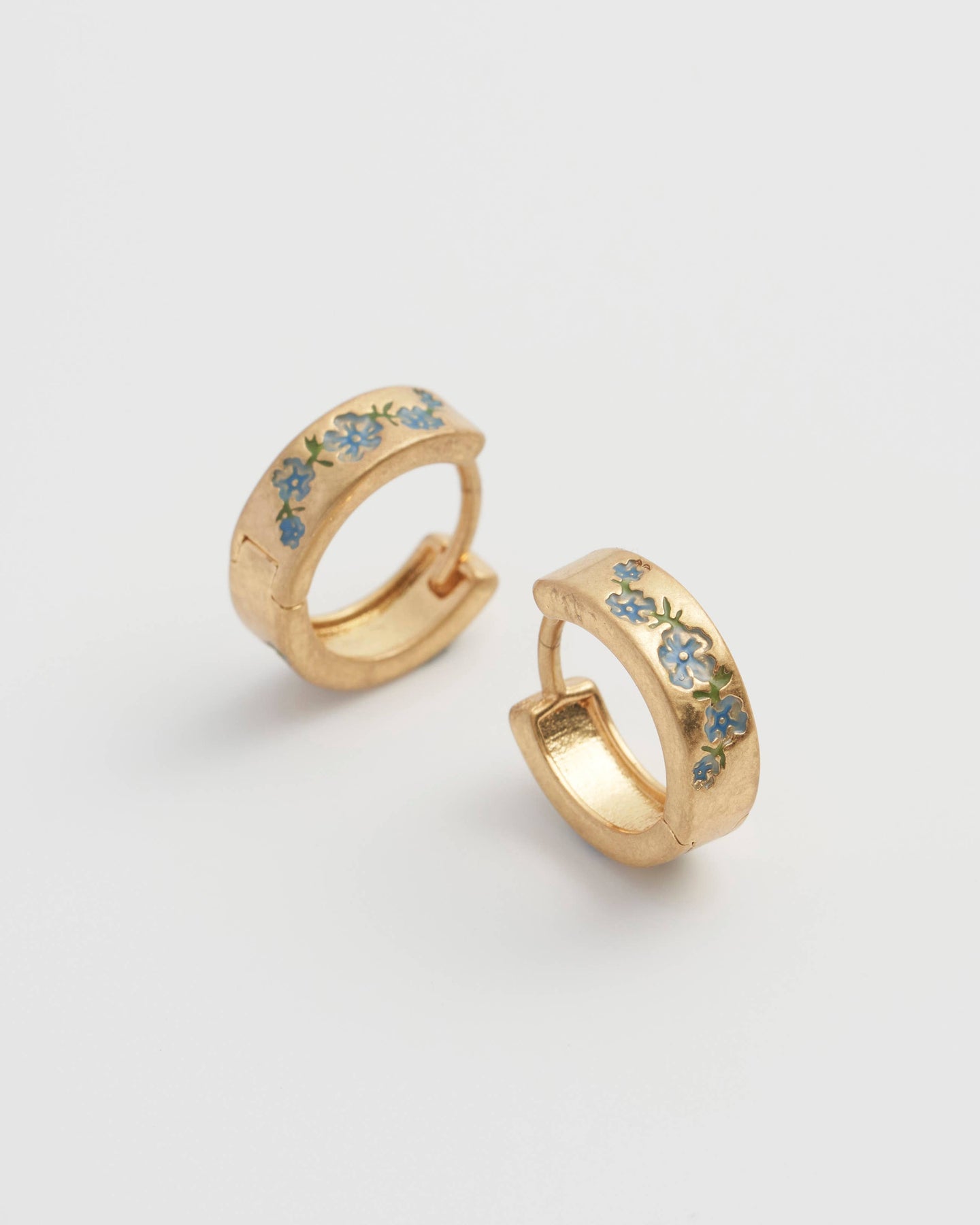 These enchanting earrings are a stunning homage to the enduring power of love that defies the constraints of time. Each intriguing enamel flower is meticulously hand-painted, showcasing vibrant blue hues reminiscent of delicate forget-me-nots—an emblem of unwavering devotion and cherished memories.
