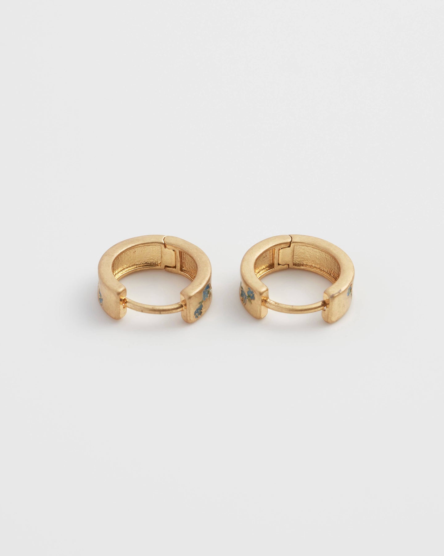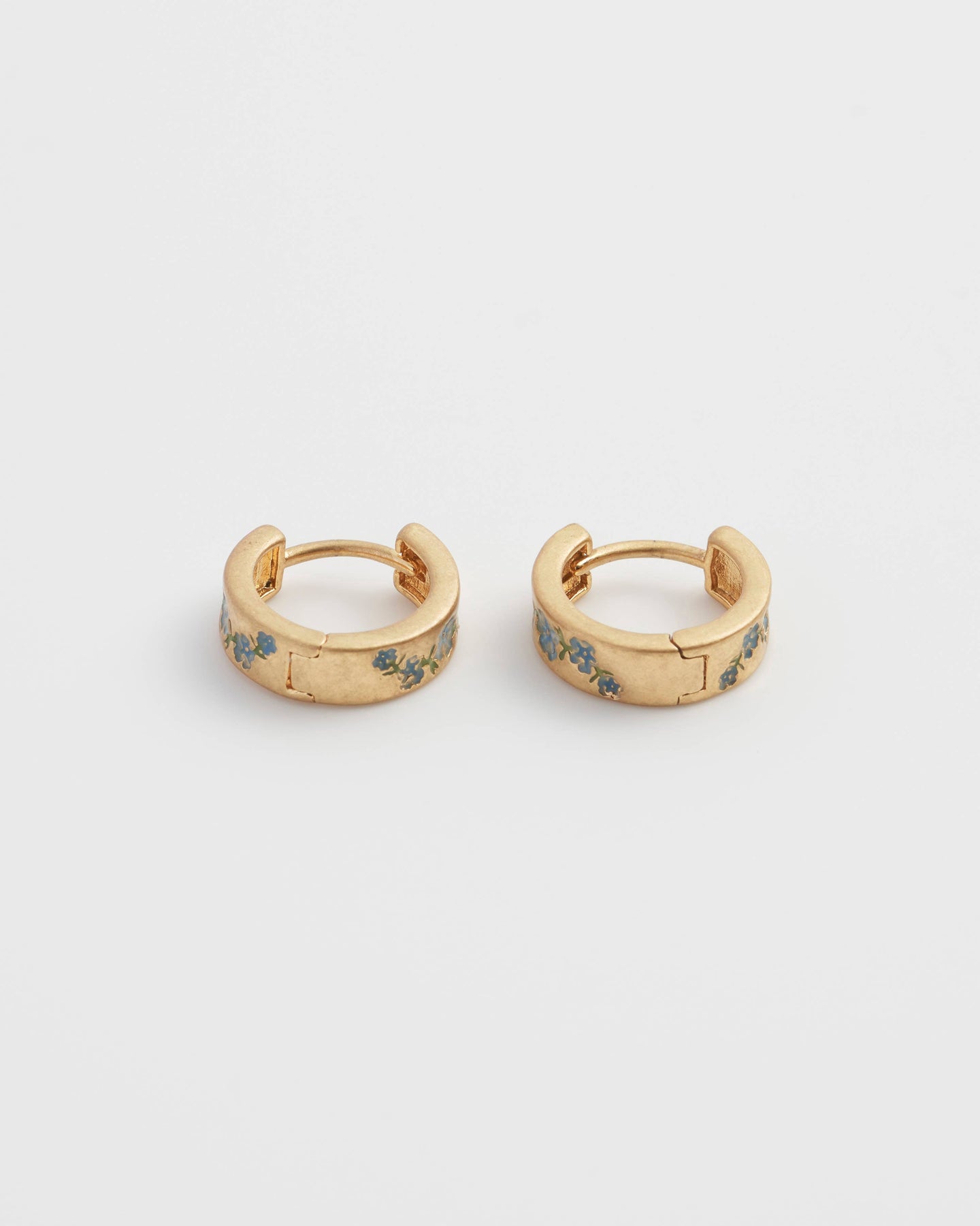 Complementing these floral masterpieces are the chunky gold-plated hoops, each featuring a luxurious matte finish that exudes an earthy texture. These earrings are part of a dazzling coordinating Forget-Me-Not set that effortlessly creates an irresistible allure. When displayed collectively, the pieces highlight nature's breathtaking beauty and fine jewelry's artistic craftsmanship, transforming any outfit into a statement of love and appreciation for the finer things in life.