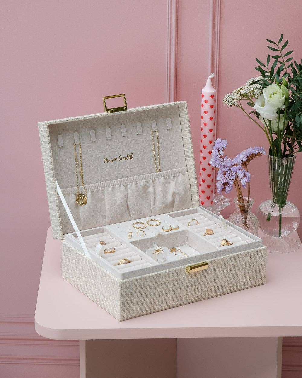 Our Louise jewelry box is a perfect alternative to the Denise jewelry box. Louise's characteristics: - Capacity: up to 40 rings, 13 pairs of earrings, 8 necklaces and 6 (large) bracelets - Dimensions: 23 cm x 17 cm x 8.5 cm (L x W x H)