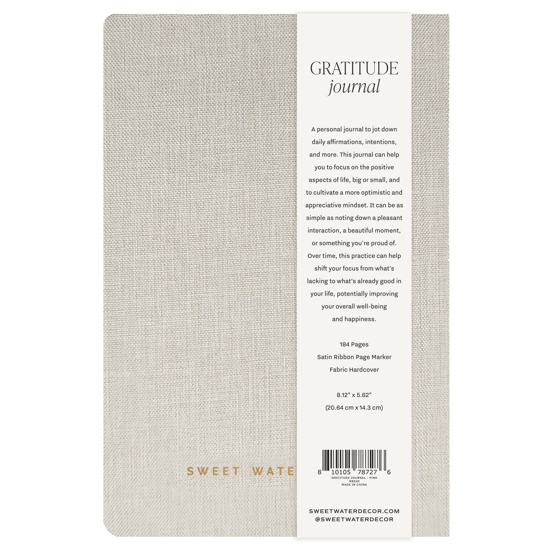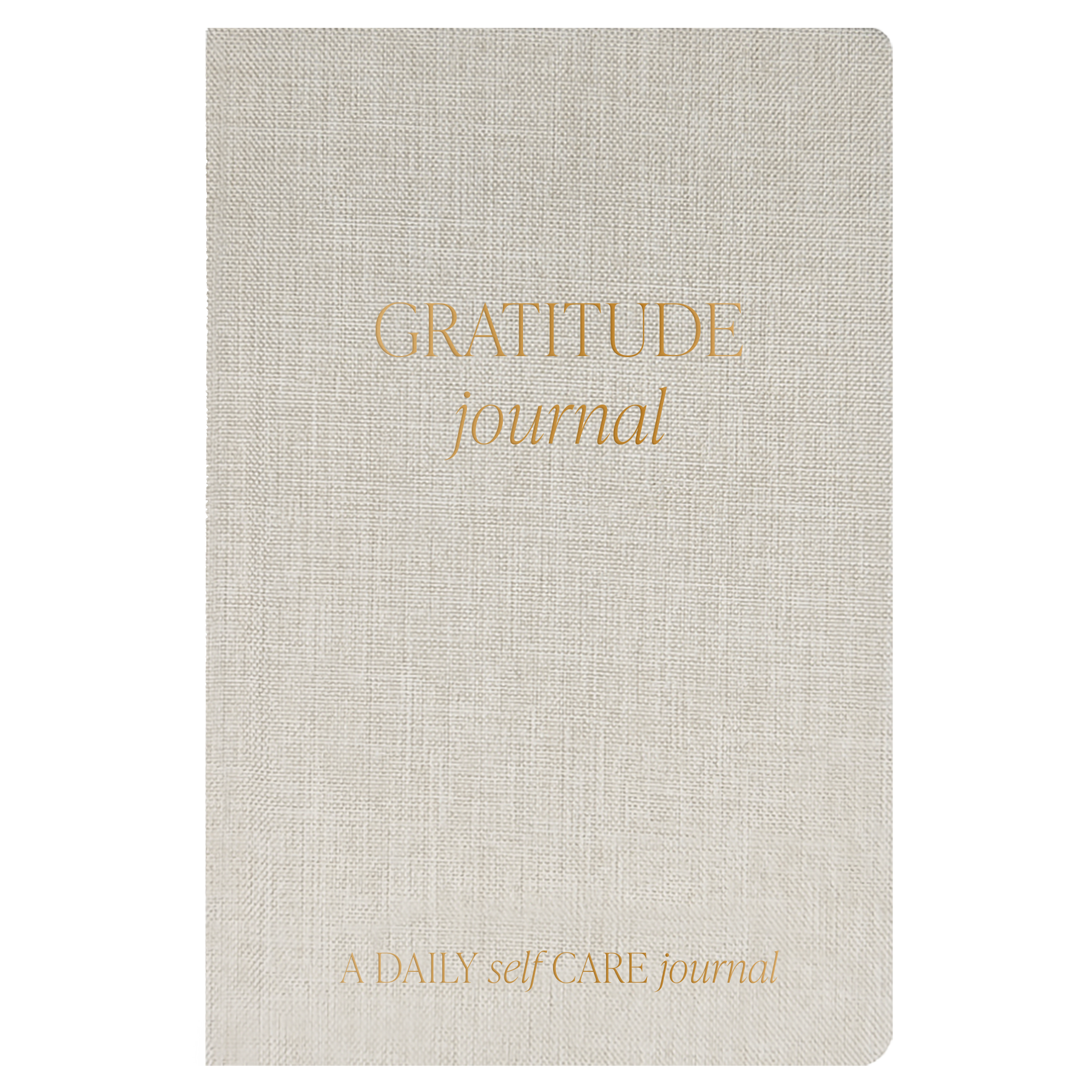 Design: Gratitude Journal (with prompts) • Tan Fabric Journal with Gold Foil Details • 100gsm Uncoated Lined Paper • Satin Ribbon Bookmark • 184 pages front and back - 1 Year of Prompts • Designed in the USA