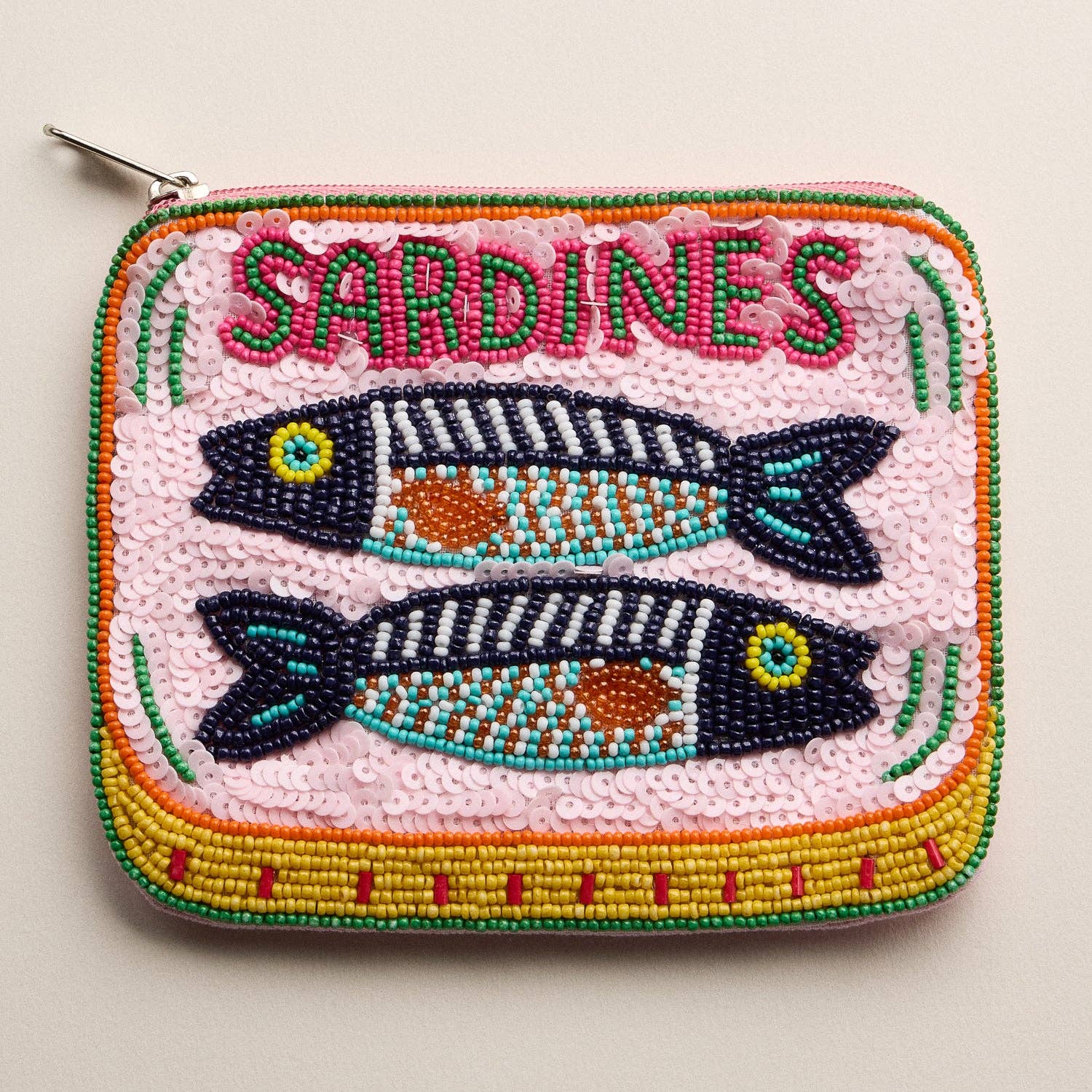 Description Add a playful pop of color to your accessories collection with this beautifully hand-beaded sardine pouch. Perfect for holding small essentials—cards, keys, lip balm, cash, jewelry—and ideal for travel, nights out, or tossing into a larger bag. A standout choice for boutiques, gifting, and summer or ocean-themed displays. Features: * Vibrant hand-beaded sardine artwork * Fully embellished front with sequins and seed beads * Pink canvas back for durability and contrast * Secure top zipper closure * Ideal for small essentials, travel, and gifting