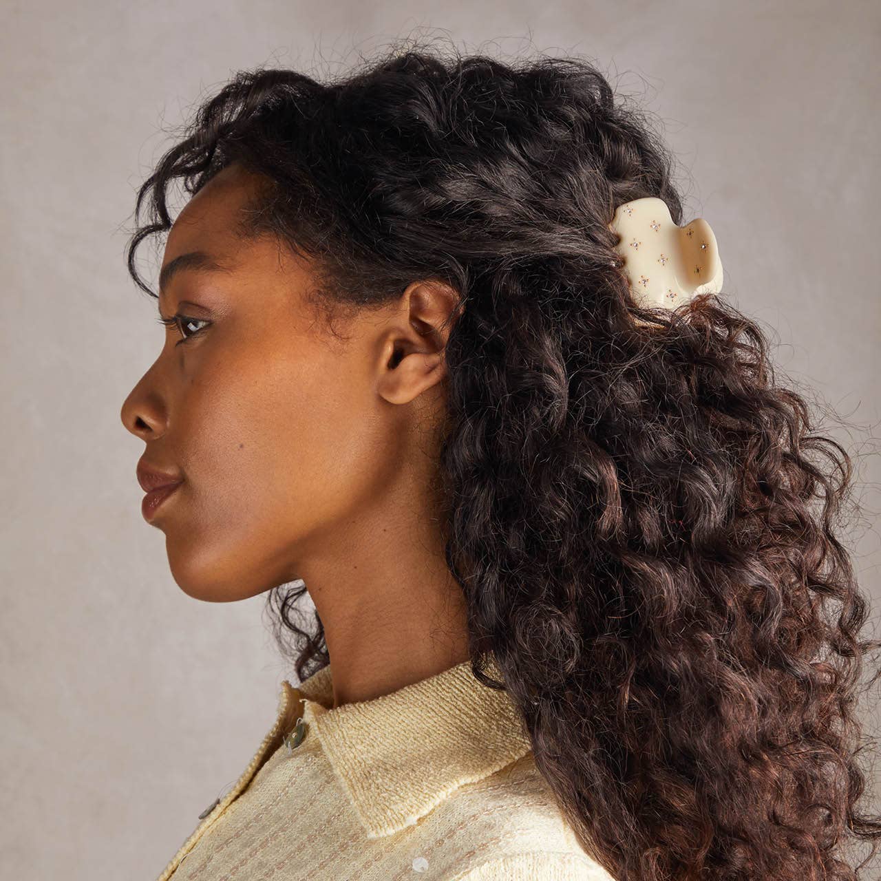 Easily twist & clip your hair into a half-up or full updo -Medium arch shape comfortably and securely holds most hair lengths and textures -Our very own cloud design with embellished rhinestones & gold studs elevates your hairstyle with added shine -Made from recycled plastic for an eco-friendly, everyday look