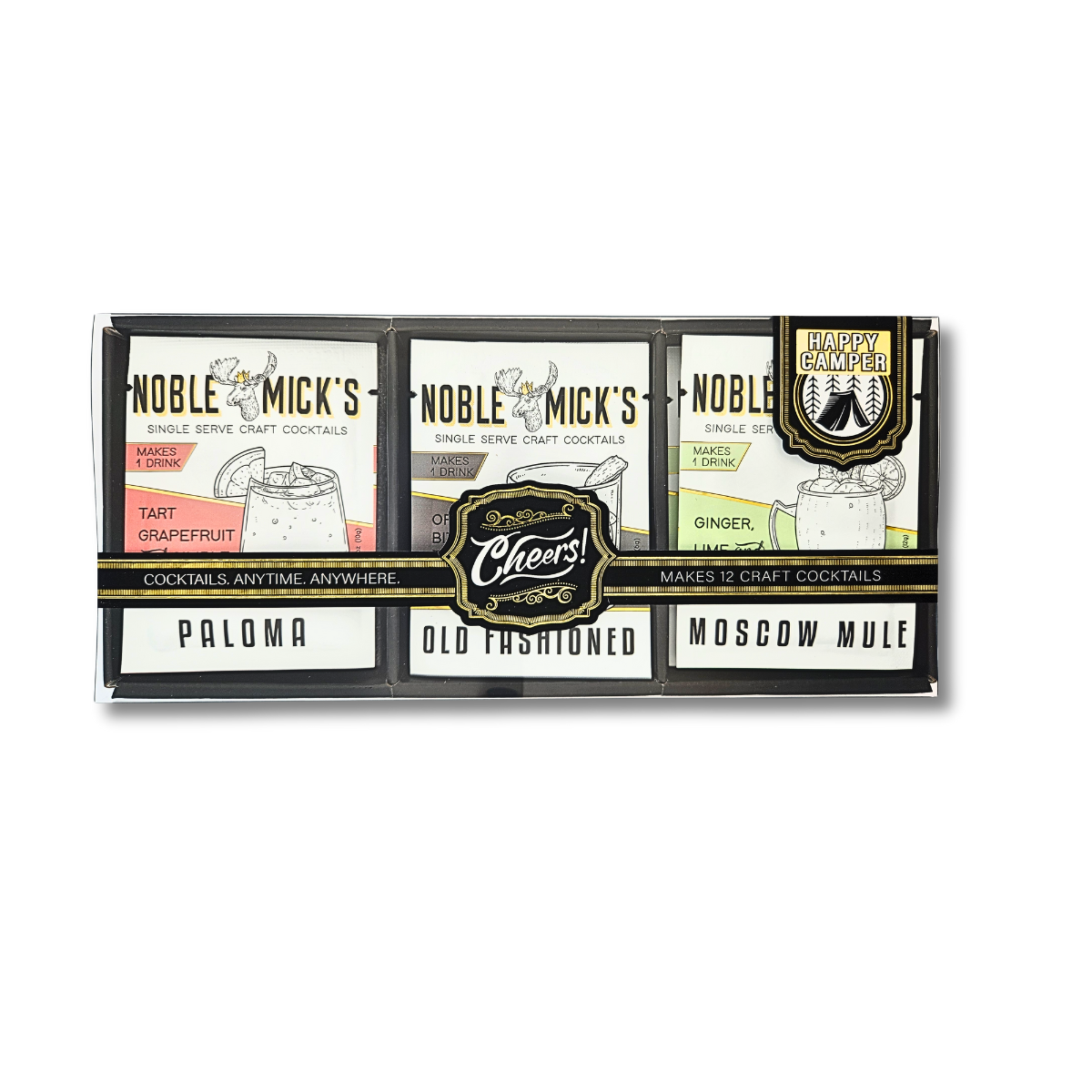 Happy Camper Gift Set - Makes 12 cocktails per gift set: 4 Paloma, 4 Old Fashioned, and 4 Moscow Mule, Drinking outdoors is one of America's favorite pastimes! No need to drag a bunch of heavy liquid mixers on your next camping trip. Giftable for that outdoorsy friend in your life. Perfect for RVing, hiking, fishing or sitting in your back yard with friends.