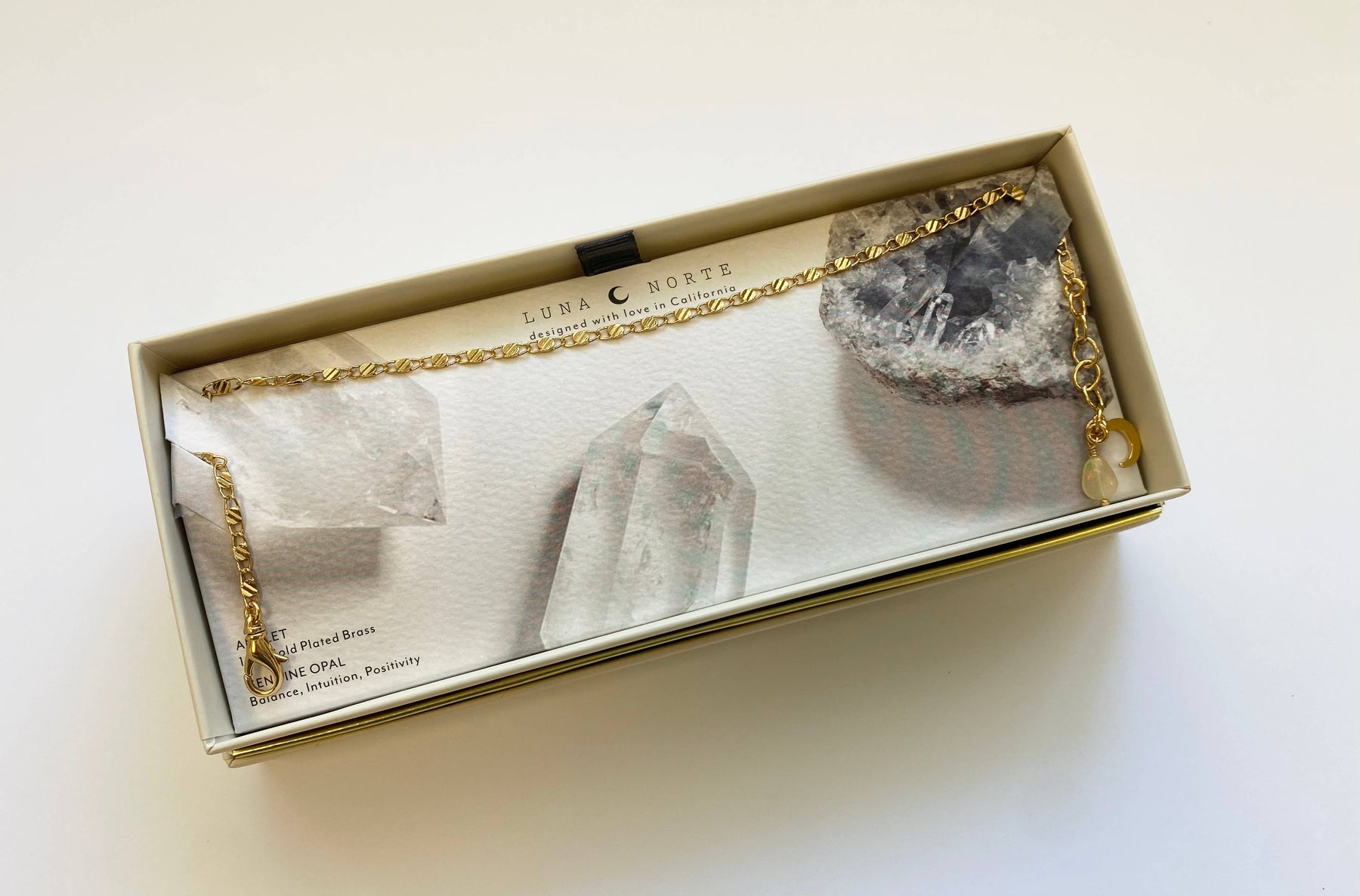 This piece boasts genuine opal complemented by a celestial-inspired moon charm. The adjustable extender chain ensures a versatile fit for any foot size. Its intricate design catches light from every angle, promising to be a show-stopper in any setting.