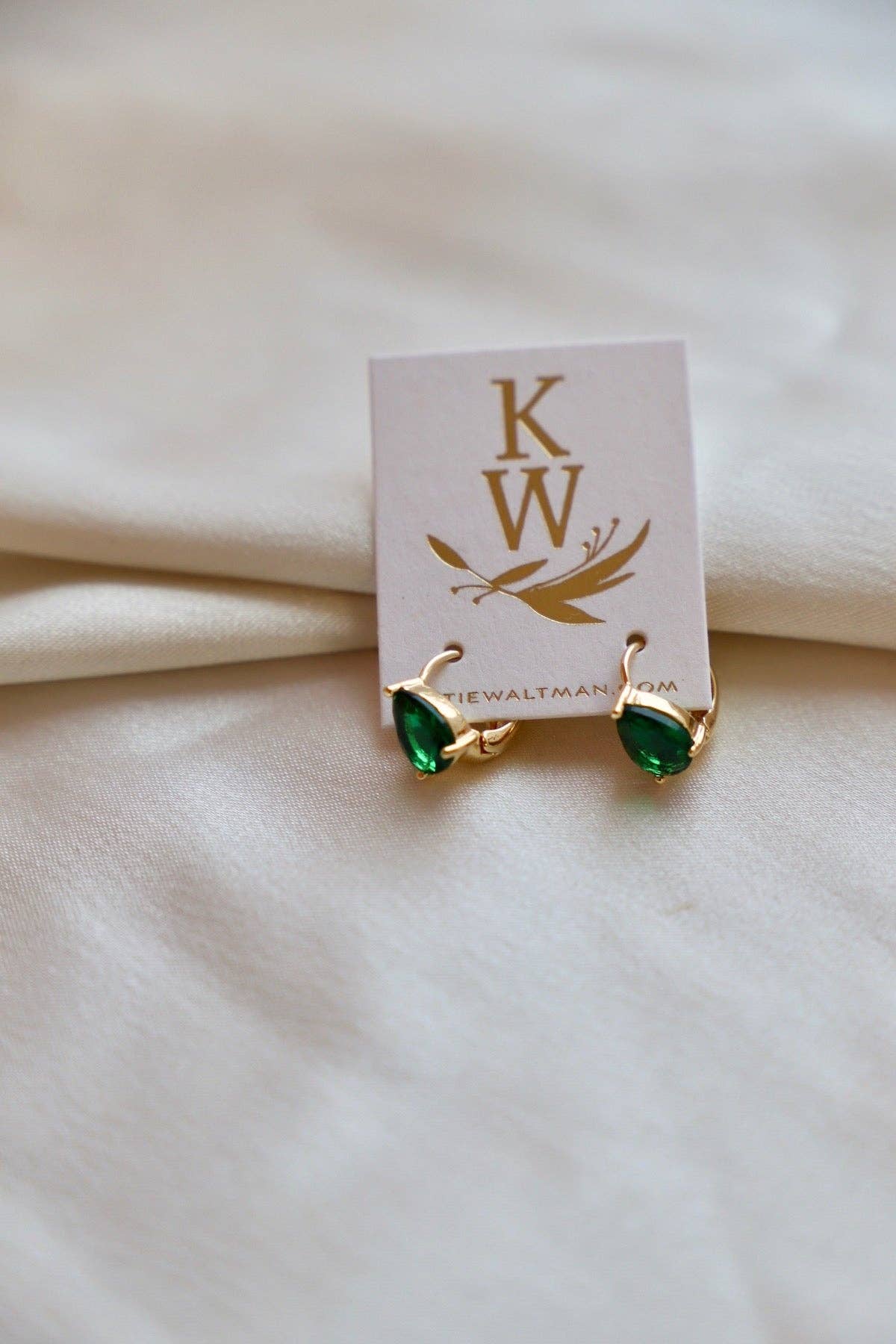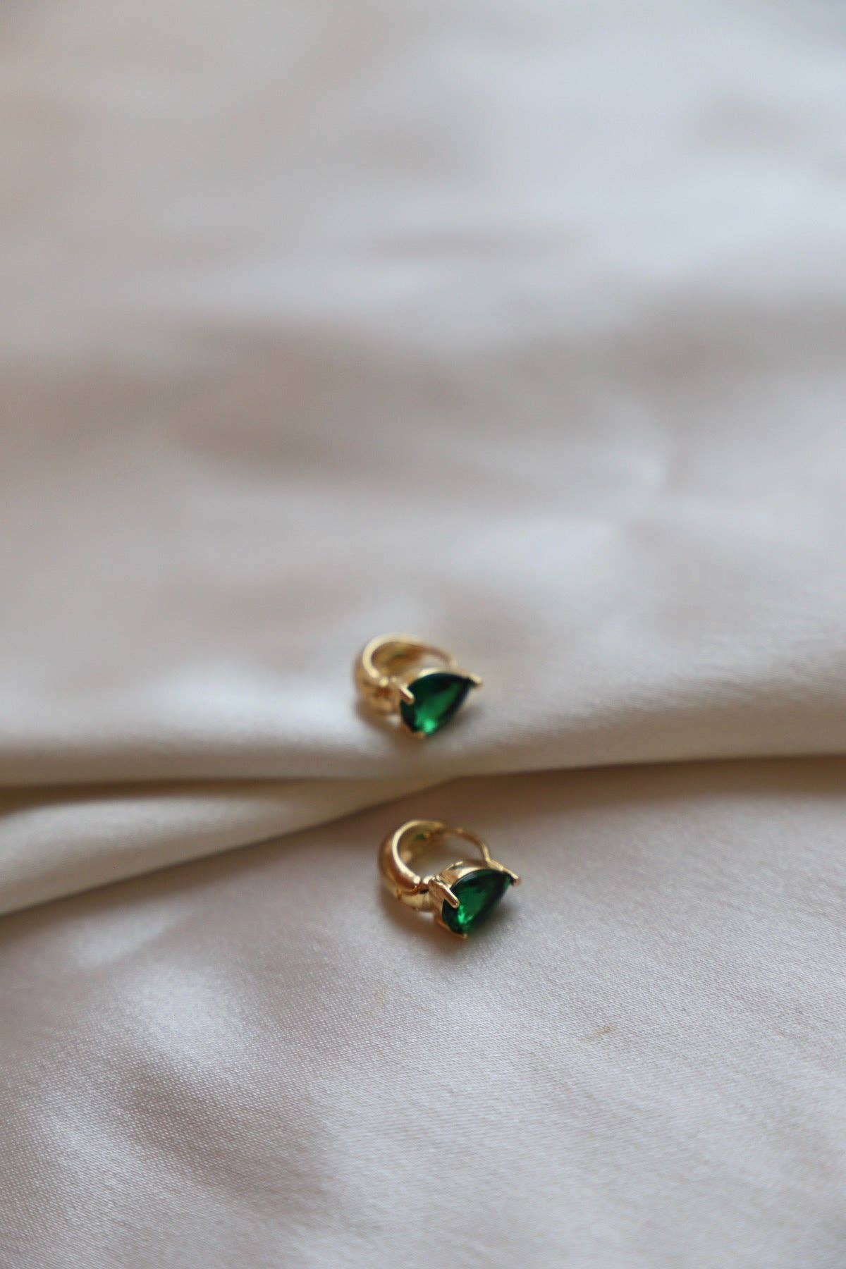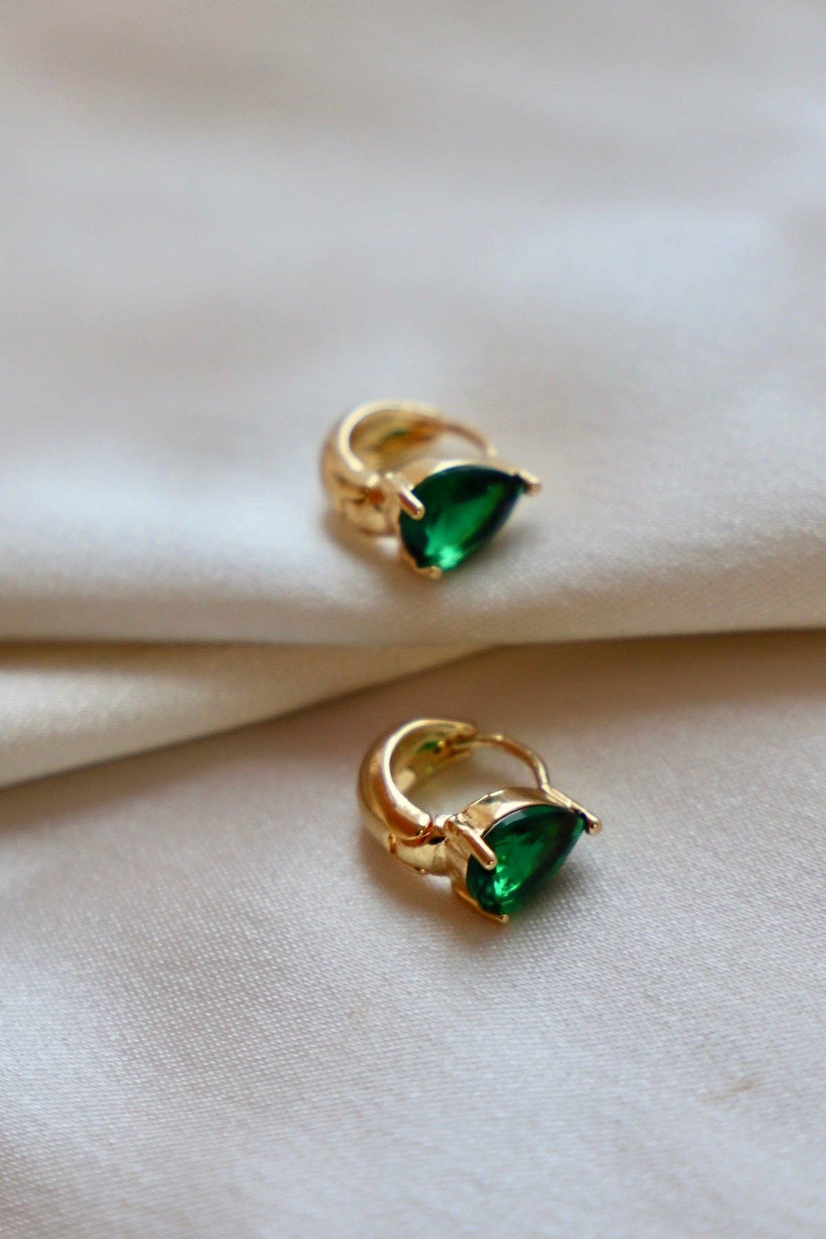 These elegant Crystal Teardrop Huggies feature a beautiful crystal emerald cz teardrop on a gold huggie earring. The combination of classic gold and sparkling crystal creates an eye-catching piece for any occasion. Materials: Crystal cz teardrop, 16kt gold plated brass huggie