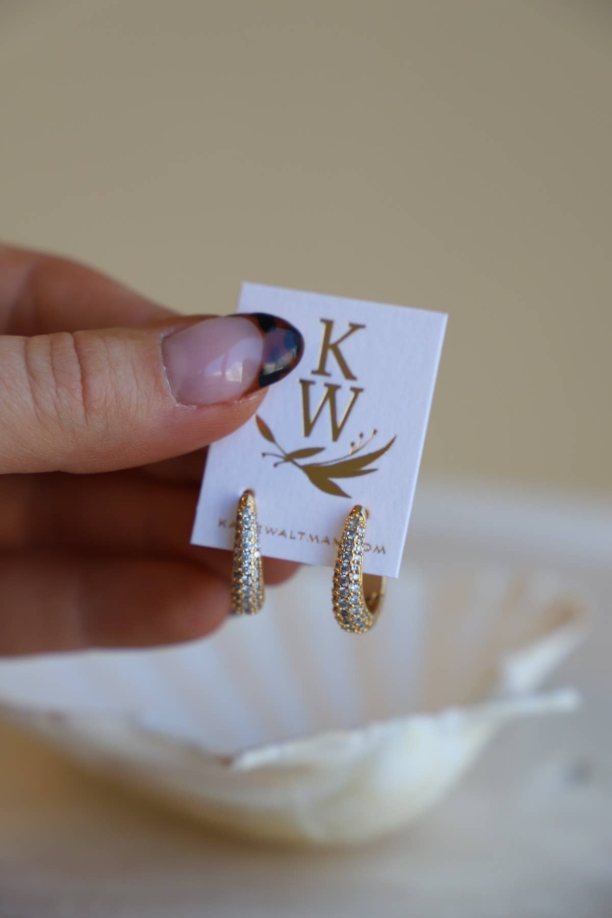 These Oval CZ Huggie Hoops feature a stunning CZ wrapped gold-plated oval hoop. Enjoy long-lasting quality and sparkle perfect for everyday wear. Ideal for both casual and formal occasions. Materials: Tarnish Resistant 16K Gold Plated Brass, cubic zirconia Size: 13.6mm x 12mm