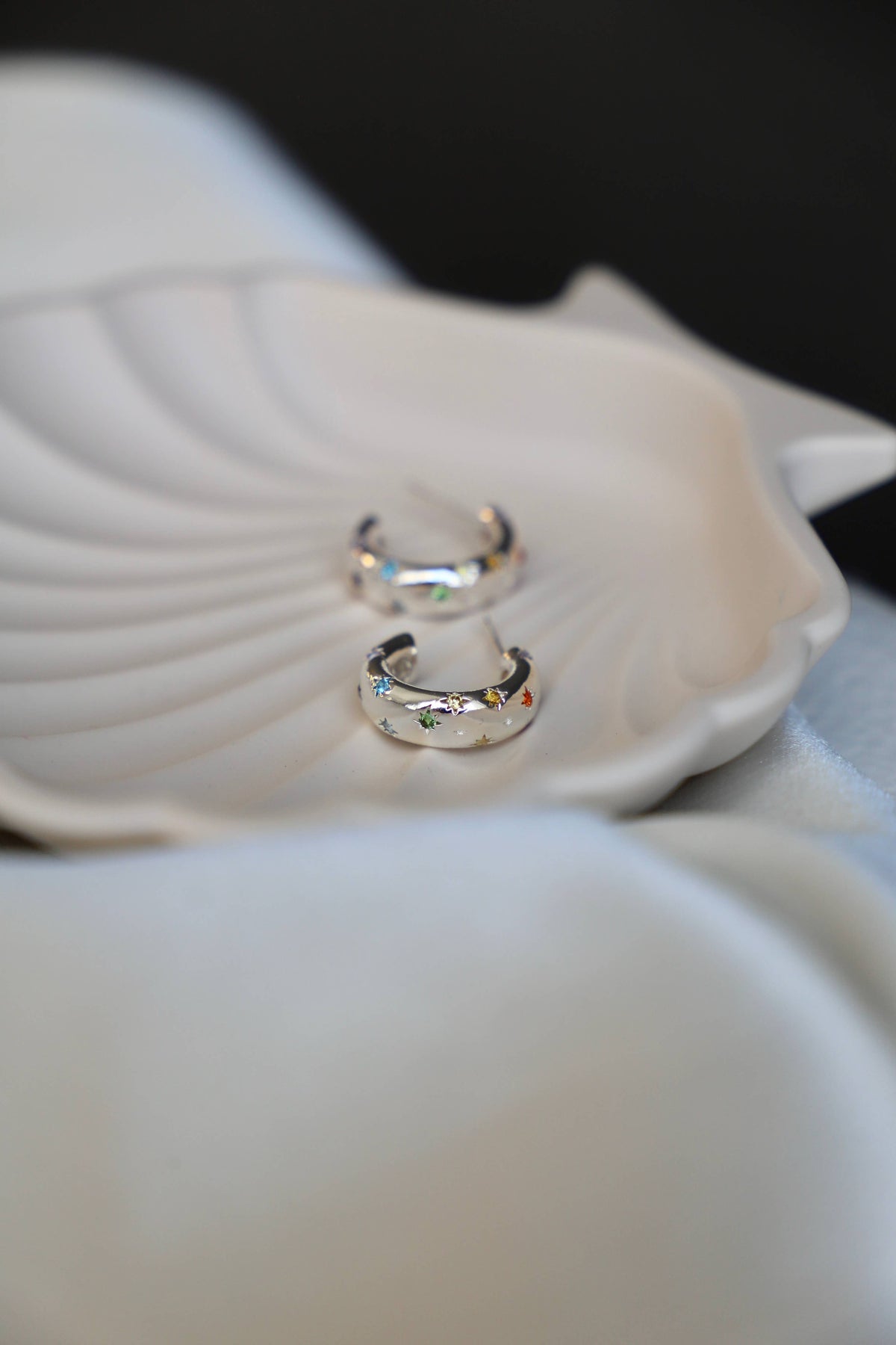 A small thick hoop with multi-colored CZ stars. These earrings are a fun twist on a classic gold hoop. The colored detailing is a subtle yet sparkly addition that you will love!