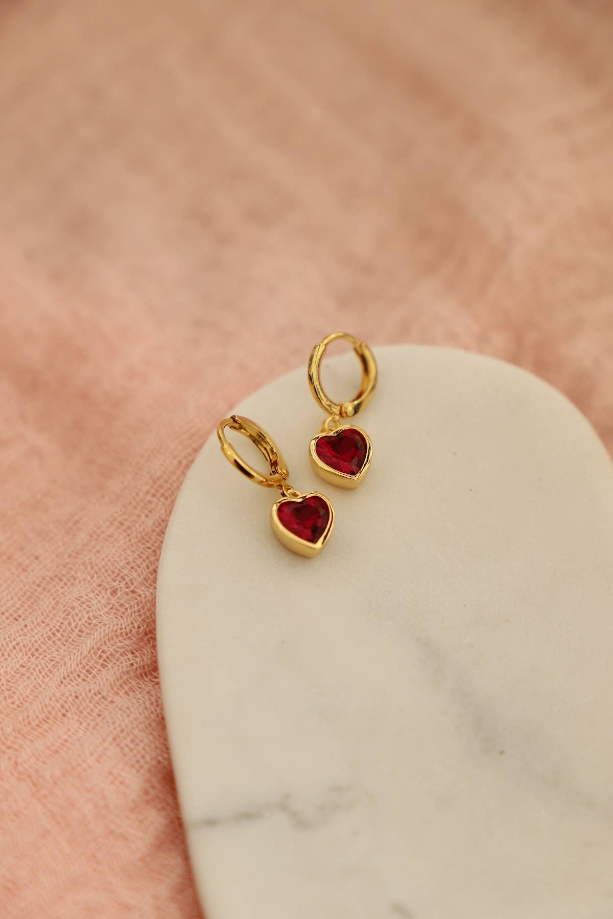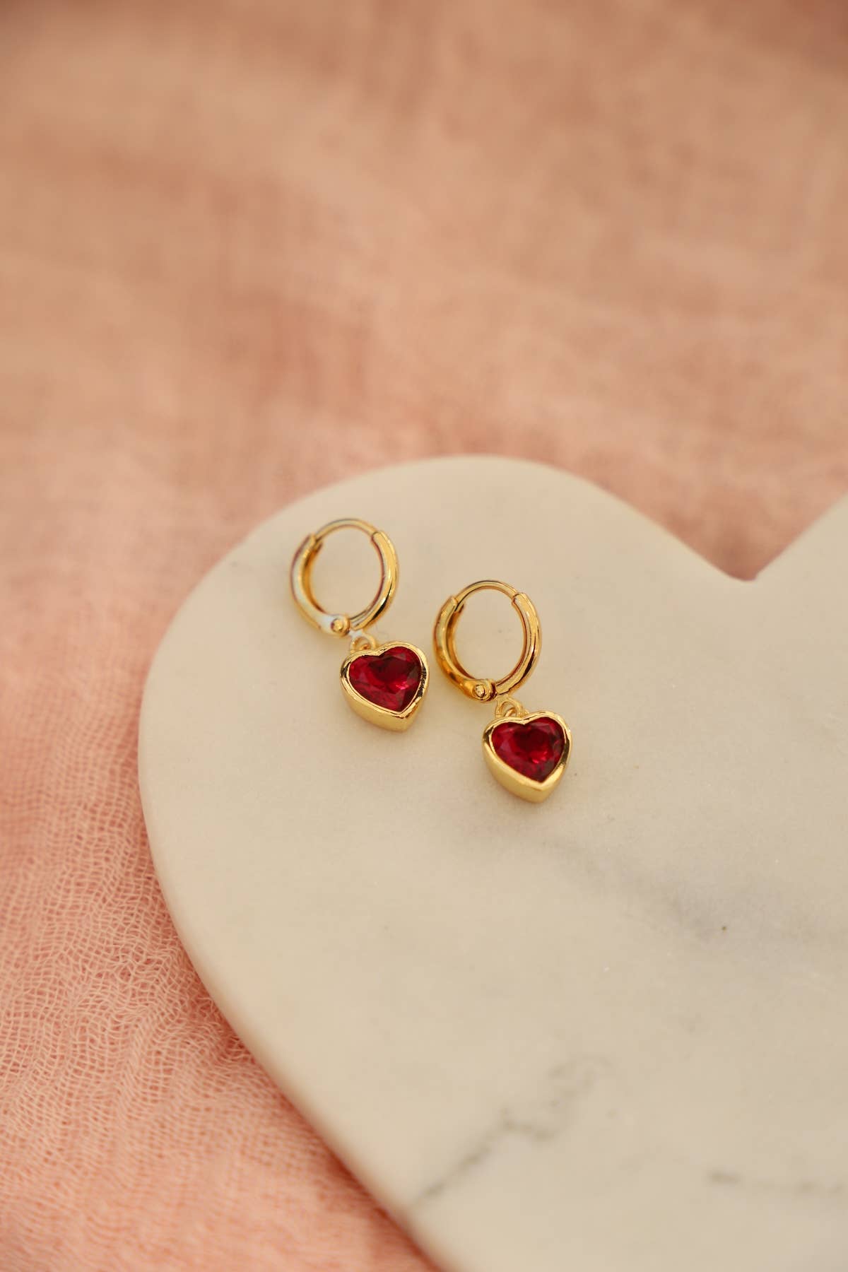 Our Ruby Heart Huggies are a truly dazzling choice. A ruby red cz stone enveloped in a gold plate bezel in the shape of a heart makes for a timeless piece and a great gift for any special someone in your life. Measurements: 8.5mm x 10mm heart, 12mm huggie