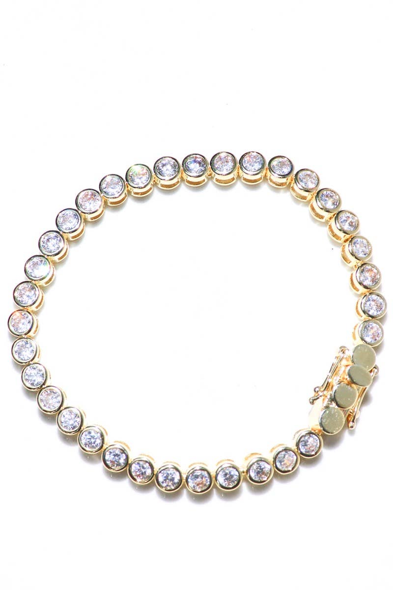 14k gold vermeil circle charm cz bracelet. Measuring 6.5 inches and features a double locking clasp for added security and peace of mind.