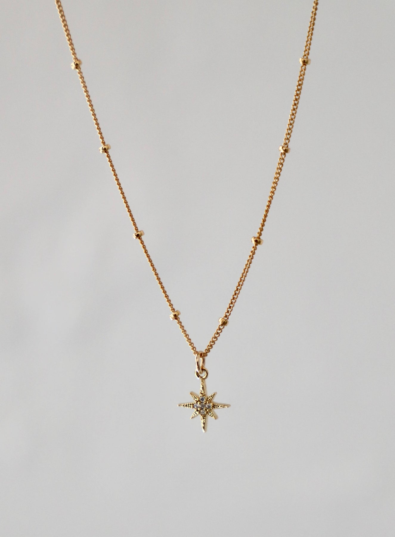 Cubic zirconia star burst charm on gold filled ball chain 14"-16" adjustable gold filled chain 16kt gold plate over brass star charm