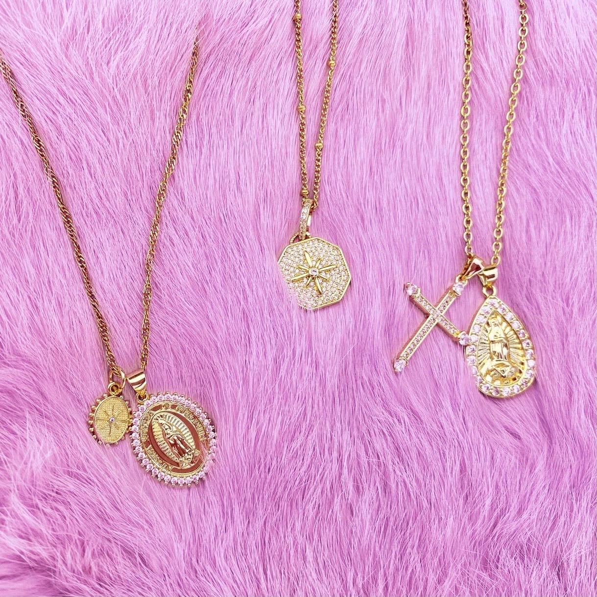 One of our original pieces and still a best seller! The light pink stones on the charm make it such a sweet and feminine reminder to say your prayers.