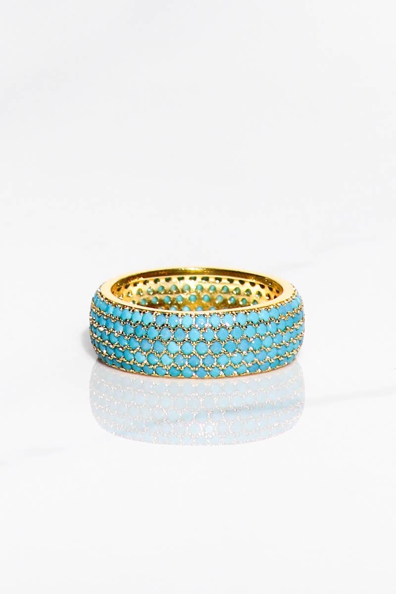 A smaller version of our best selling cigar-style ring. It features turquoise pave cz and yellow gold vermeil.