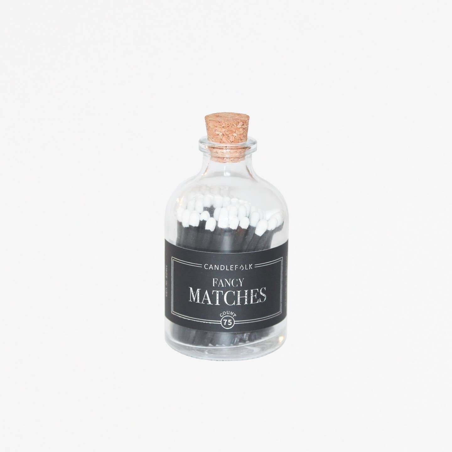 Colored tip matches in an apothecary-inspired glass bottle with a cork top and a striker on the bottom.