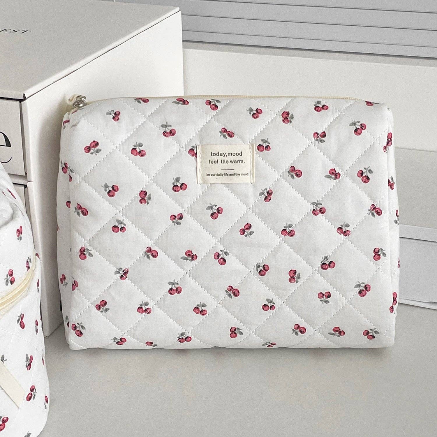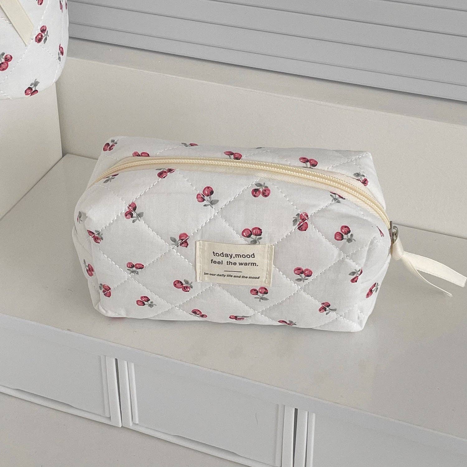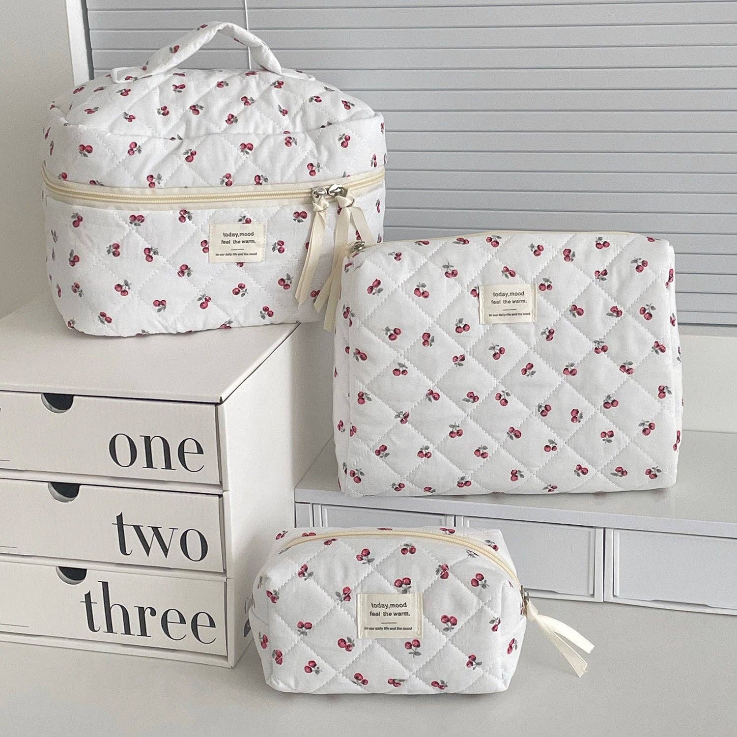 Feature: * Cherry Print * Padded * Beige Cotton Canvas Lining Inside * Portable * Simple, Sweet * Zipper Closure Material: * Cotton and Polyester Size: 25 * 16 * 15cm/24 * 19 * 7cm/15 * 9 * 7.55cm Package: * Package include 1 * cosmetic bag.