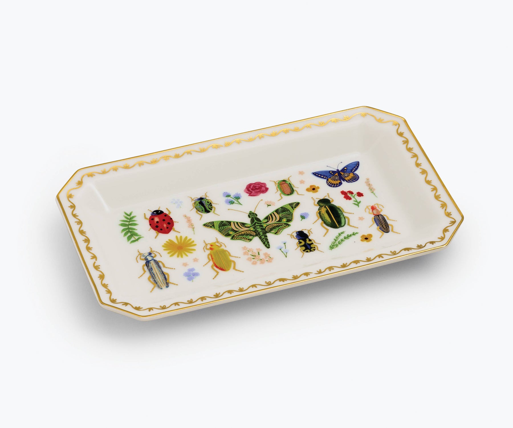 Keep track of all your trinkets with our large catchall tray, perfect for collecting mail, keys, or jewelry. This dish features the beetles, bugs, and flowers of our Curio print, with gold accents and a gilded rim for extra shine.