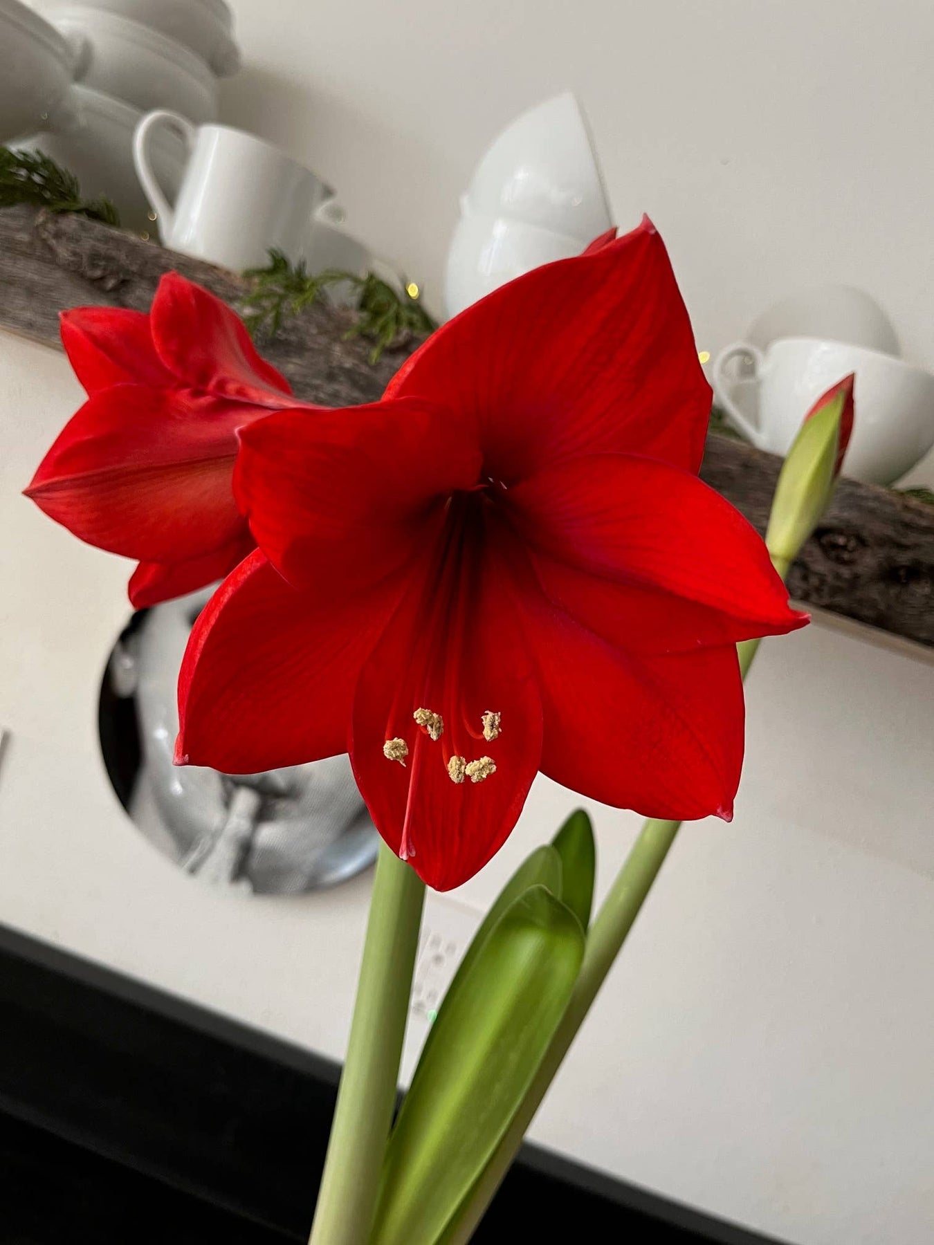 Amaryllis Winter Garden The classic Christmas holiday gift. With beautiful blooms and sturdy stems, Amaryllis are said to symbolize love & strength. These winter blooming flowers are easy to grow and have been given as holiday gifts for centuries. includes: cast glass planter, amaryllis bulb (Amaryllis red lion), soil-less growing medium and directions . handmade in Idaho Once planted, amaryllis bloom time is 6-12 weeks. Keeping plants cool (around 65 degrees F) will extend bloom time.