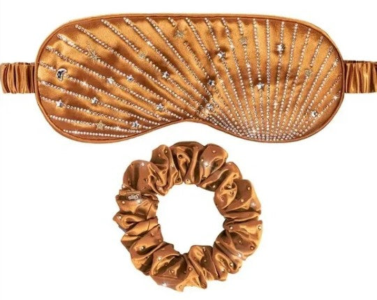 Celestial Nights: LiMiTED EDiTiON SET FEATURiNG A BRONZE COLORED SLEEPMASK MADE FROM PURE SiLK WiTH CRYSTAL EMBELLiSHMENTS. PAiRED WiTH A MATCHiNG SCRUNCHiE SET