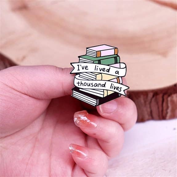 Celebrate a love for reading with this whimsical enamel pin featuring pastel book spines and the quote "I've lived a thousand lives." A must-have for introverts, bookworms, and literary dreamers, this pin adds charm to jackets, totes, and book bags. Sturdy metal backing with rubber clasp ensures it stays secure.