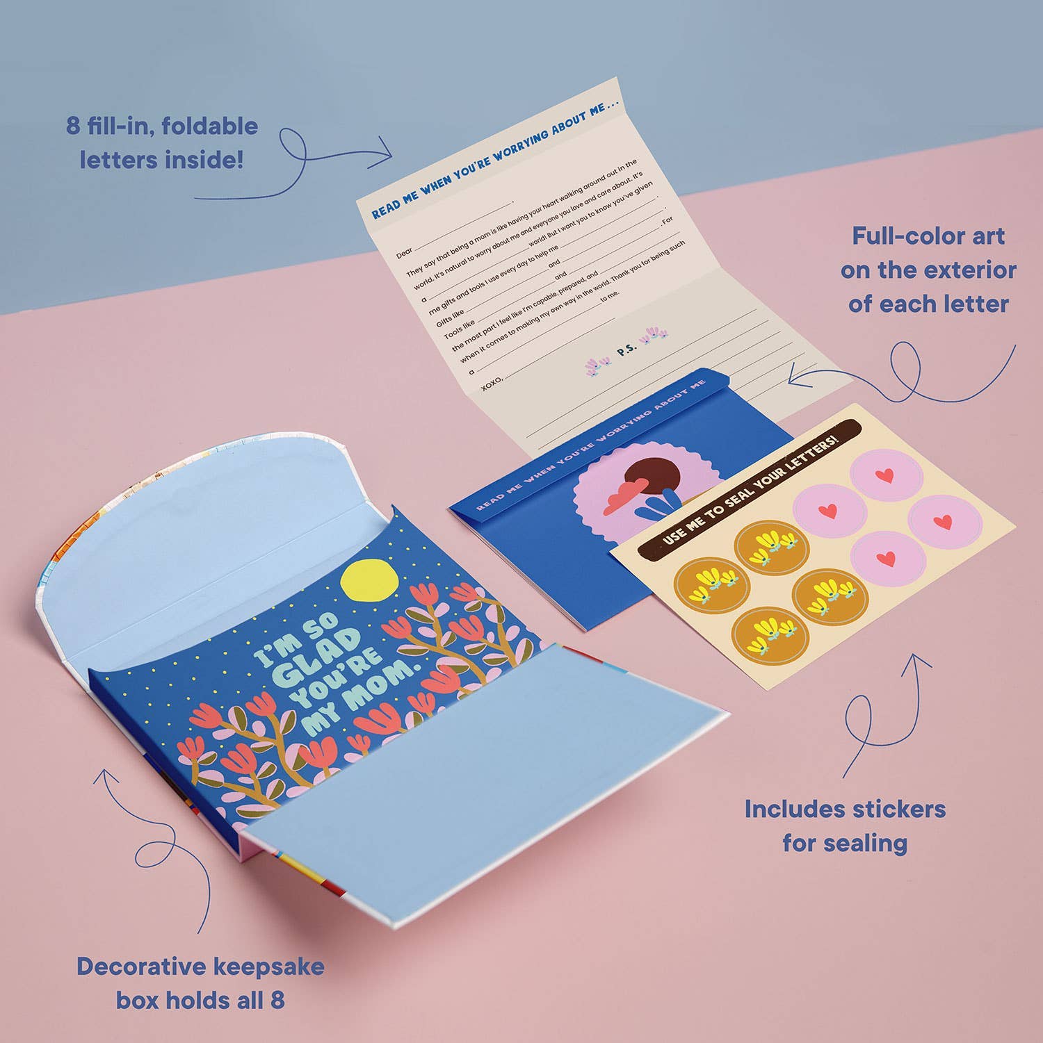 • 8 customizable, fill-in-the-blank letters with special sealing stickers in a super cute keepsake box; 6 inches x 4.25 inches Letters Include: When You Want to Feel Totally Adored, When You’re Feeling Blue, When You Want to Hear How Gorgeous You Are, You’re Feeling Self-Critical as a Mom, When You’re Worrying About Me and more!