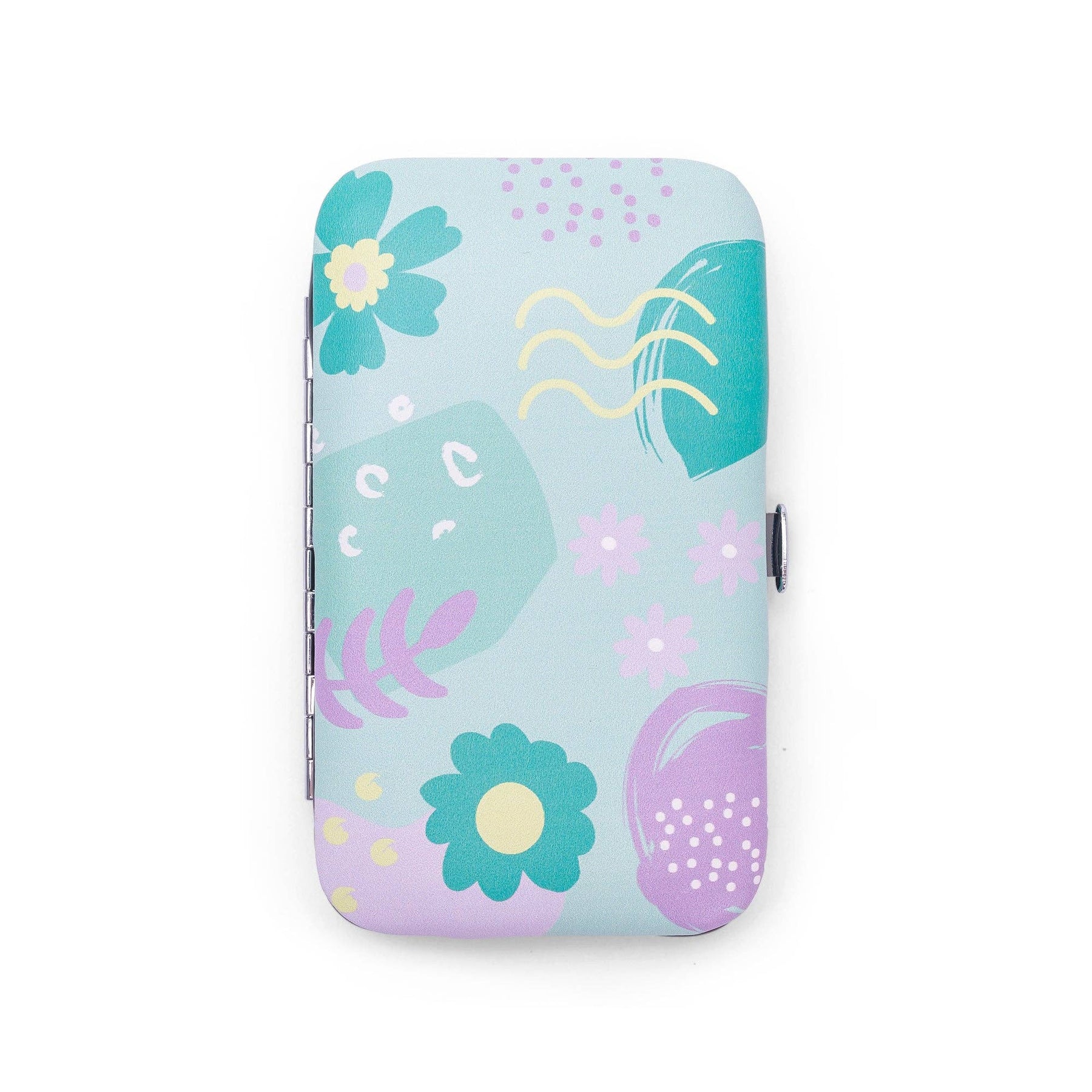 Manicure set with 5 stainless steel tools (nail file, tweezers, cuticle tool, nail clippers, cuticle scissors) in a durable PU case. Stylish and portable for on-the-go use.