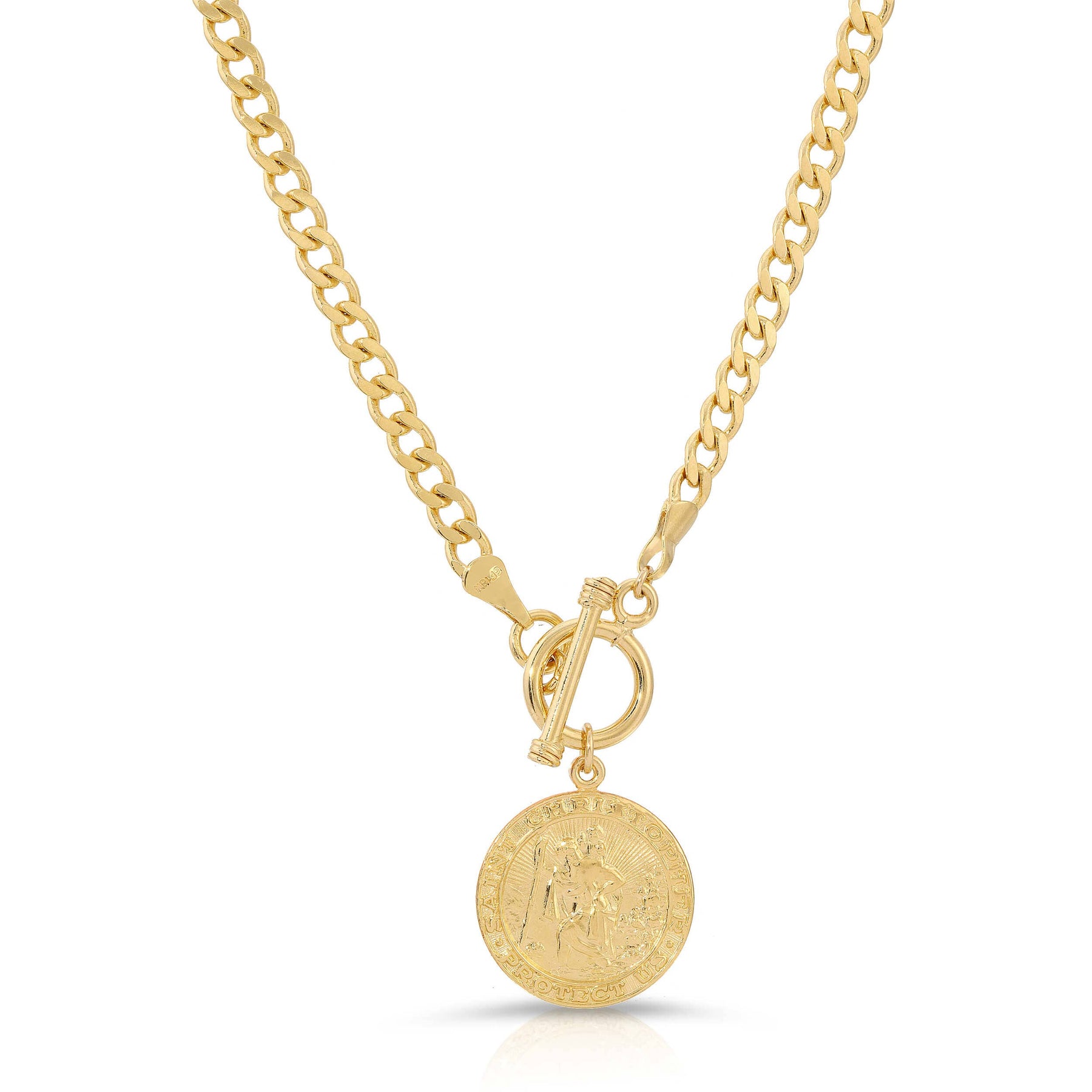 A high quality Saint Christopher charm hangs on a Figuaro toggle chain 14K Gold Filled charm, heavy 5mm Brazilian Gold Filled chain Pendant is 17mm round