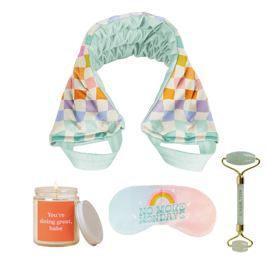 Self care looks good on you! Treat yourself (or gift it to someone) who needs a little tlc. Each kit includes a weighted neck wrap, weighted eye pillow, jade stone roller, and 8oz. Candle jar to inhale good vibes and exhale stress. And did we mention that each kit comes in a colorful box with magnetic closure, so cute!