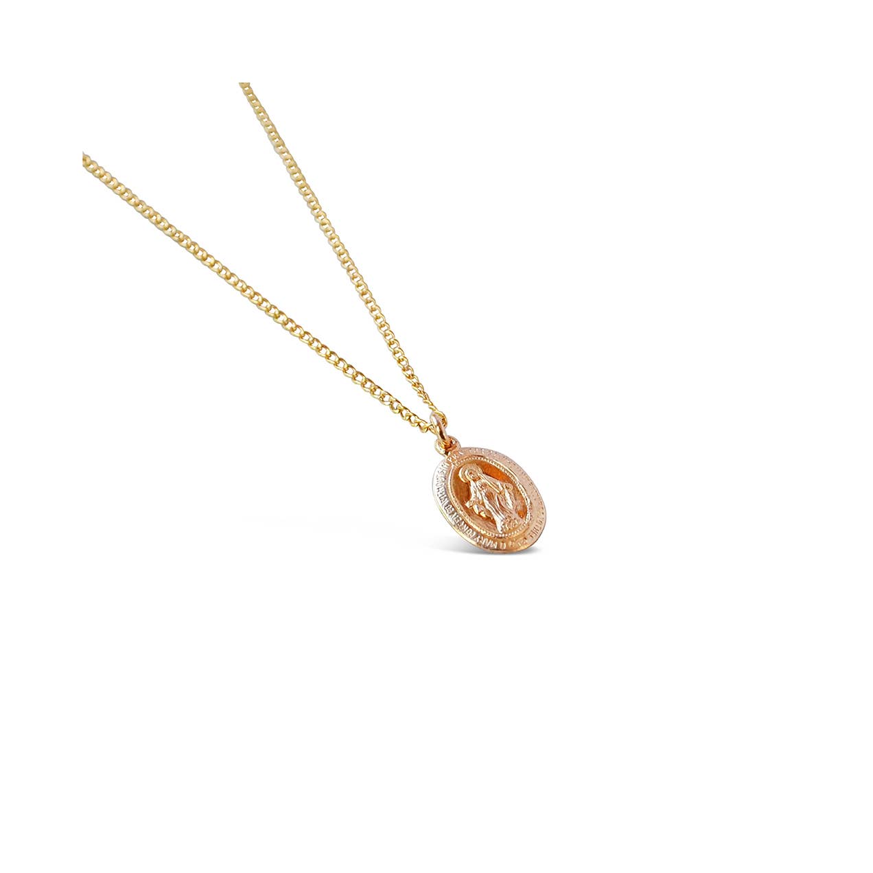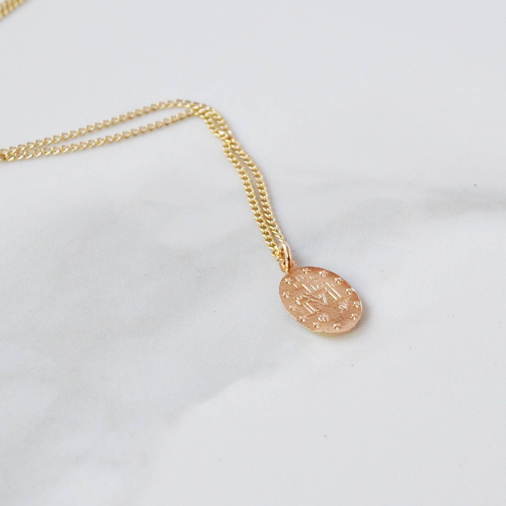 A small double sided, Mary Charm hangs on a delicate curb Chain. all 14K Gold Filled Pendant is 12mm x 9mm