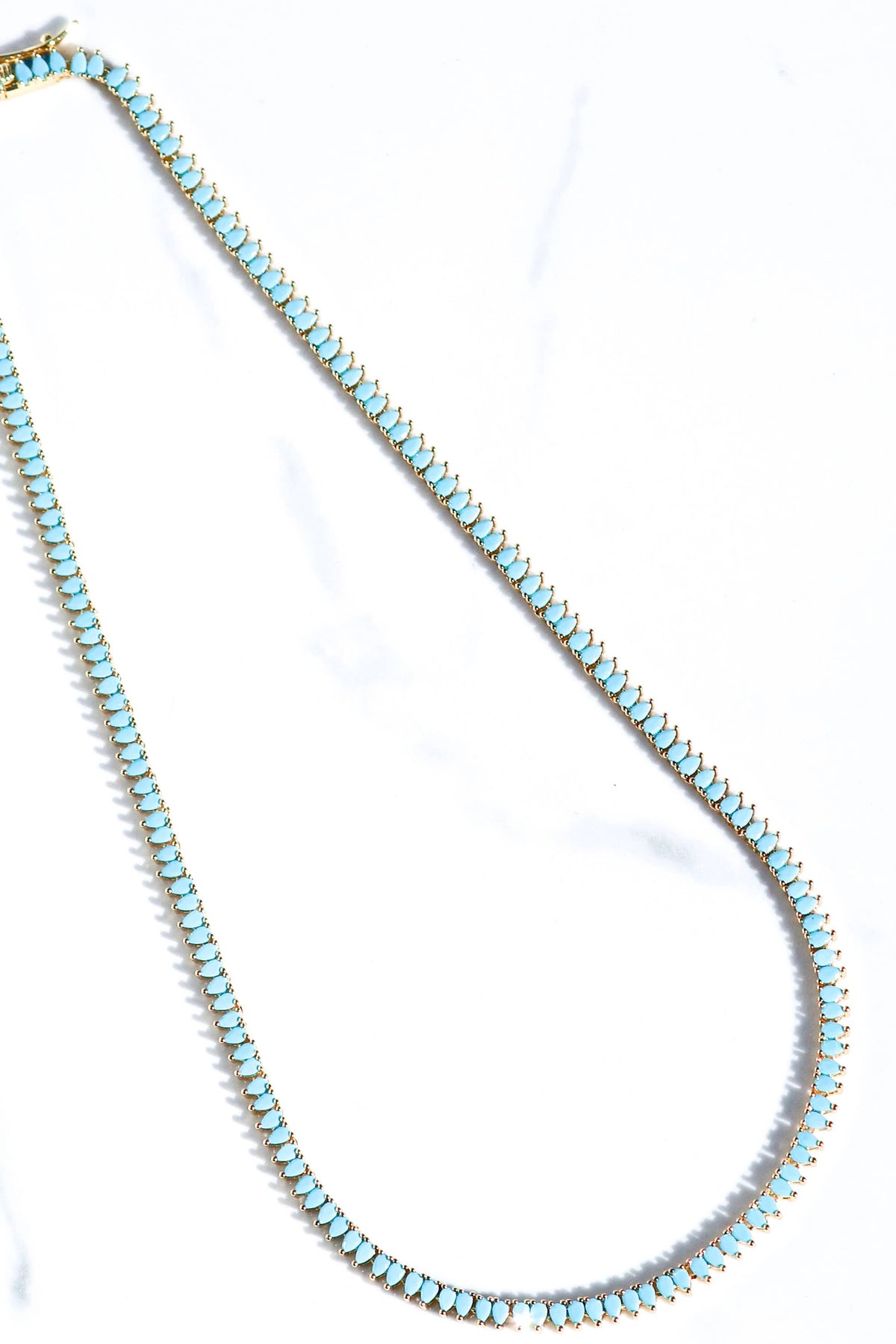 Crafted in 14K gold vermeil, this elegant tennis necklace features a stunning arrangement of turquoise teardrop cubic zirconia stones that catch the light with every movement. Measuring 16 inches and features a double locking clasp for added security and peace of mind.